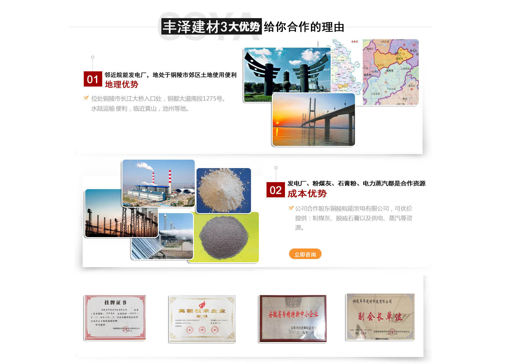 銅陵豐澤建材科技有限公司成立于2007年2月,坐落于銅都大道南段,占地4萬(wàn)平方米,公司注冊(cè)資金1000萬(wàn)元,現(xiàn)有職工百余人,是一家與皖能發(fā)電公司合作,專(zhuān)業(yè)從事電廠(chǎng)粉煤灰開(kāi)發(fā)利用的高新科技企業(yè),現(xiàn)擁有一條年產(chǎn)30萬(wàn)立方米蒸壓加氣混凝土全自動(dòng)生產(chǎn)線(xiàn)。 蒸壓加氣混領(lǐng)土(英文名Autoclaved aerated comcrete),也稱(chēng)AAC,是以砂、粉煤灰等硅質(zhì)材料和石灰、水泥等鈣質(zhì)材料為主要原料,摻加鋁粉為發(fā)氣劑,進(jìn)行生產(chǎn)的新型墻體材料。是我國(guó)推廣應(yīng)用最早,使用最廣泛,技術(shù)最完整的輕質(zhì)保溫墻體材料之一,自問(wèn)世以來(lái),始終方興未艾,備受推崇。